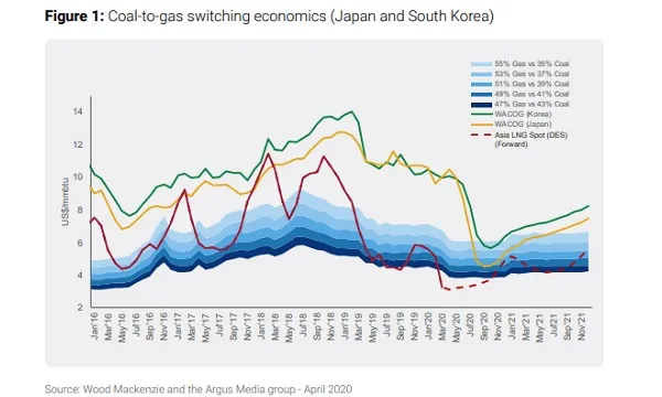 The collapse of oil prices since March could spur a switch from coal to gas in Japan and South Korea’s energy markets, as it could cause the generation cost gap between coal and gas to narrow significantly, according to a Wood Mackenzie report.