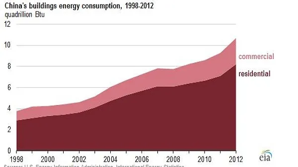 Menurut Energy Information Administration dari A.S., dari 1998 hingga 2012, konsumsi energi pada bangunan-bangunan di Cina tumbuh sekitar 7,7% per tahun, jauh lebih cepat daripada peningkatan populasi tahunan rata-rata Cina, yang kurang dari 1% per tahun.