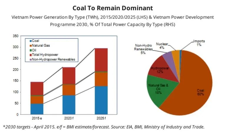 BMI mengatakan bahwa ketergantungan yang meningkat pada pembangkit listrik tenaga batu bara ini sejalan dengan Power Development Programme milik Vietnam, yang membayangkan bagian batubara dalam bauran listrik meningkat menjadi sekitar 60% pada tahun 2030 (direvisi pada bulan April 2015). Namun, pengumuman pada Januari 2016 bahwa pemerintah akan meninjau pengembangan semua pembangkit batubara baru yang bertentangan dengan Power Development Programme dan mengirimkan pesan beragam mengenai agenda energi masa depan Vietnam.