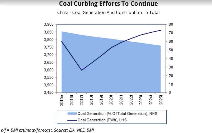 The successful implementation of coal capacity restrictions by the NEA will help to address the thermal overcapacity in the market and reduce coal consumption - paving the way for alternative fuels to gain share in the power mix, including renewable energy, according to BMI Research.