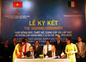 The 110KV Ha Tien – Phu Quoc submarine cable system project will soon commence and is expected to be completed in 2013. Southern Power Corp. or EVNSPC and Italian-based Prysmian Powerlink Group have signed a contract for its execution, supply and installation. Upon completion, the 55.813km cable system with a capacity of 131MVA will be the longest of its kind in South-East Asia. The project has an estimated investment of US$118 million jointly funded by a World Bank loan and EVNSPC capital. “Ha Tien – Phu Quoc 110KV submarine power cable project is aimed at increasing capacity of power supply for Phu Quoc in order to contribute turning Phu Quoc into an important economic special zone and a high-quality tourist region of the whole country,” said Nguyen Thanh Duy, EVNSPC chairman and general director. The agreement was signed by Pham Ngoc Le, EVNSPC’s deputy general director, and Marcello Del Brenna, CEO of Prysmian Group, witnessed by leaders from the Government Office, Ministries and Sectors from central government, Kien Giang Province, Vietnam Electricity Corporation, and representatives of the Italian Embassy to Vietnam. “This development will imply more projects to be implemented in the island, more international investments to come to Phu QUoc and clearly also power usage will increase,” said Marcello Del Brenna. For more, click here.