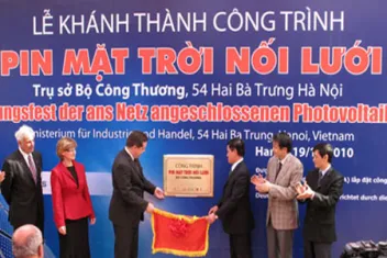 Vietnam hopes to generate 18,000 KW annually with its first grid connected solar system . The network, installed on the roof of the Ministry of Industry and Trade office will help to save roughly US$612 in power bills for the office. Mr. Stefan Mappus, Governor of Baden - Württemberg and Deputy Minister of Industry and Trade Le Duong Quang inaugurated the grid connected solar system on the rooftop of MOIT’s building. The ceremony had the attendance of representatives from more than 50 leading German companies and representatives from related departments of the MOIT.