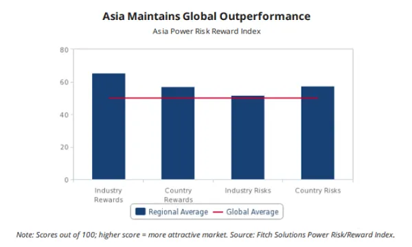 Asia’s Power Risk Reward Index (RRI) profile maintained its global outperformance, after exceeding the global average in every key component, according to a report by Fitch Solutions.