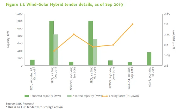 According to an analysis by JMK Research & Analytics, the low ceiling tariffs of 3.8 cents (INR 2.7) per unit set by SECI as well as the technical challenges to integrating both wind and solar with the grid on the DC side.