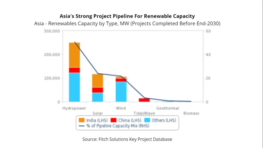 A total of 249 gigawatts pf major hydropower and non-hydropower renewables is expected to go online across Asia by the end of 2030, Fitch Solution reported.